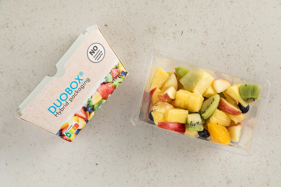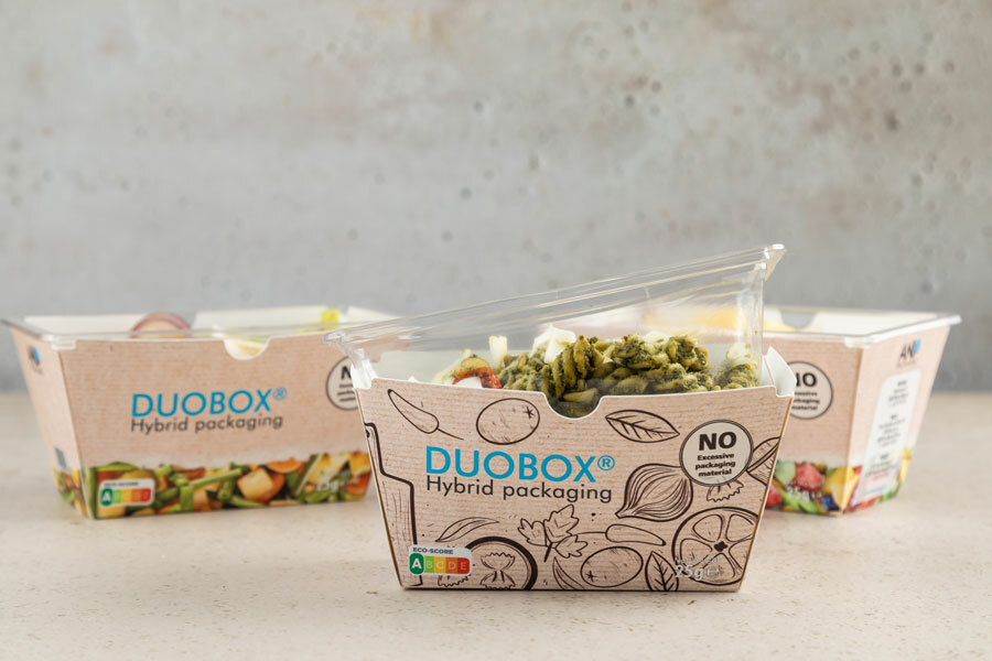Das Ergebnis ist die Duobox. Diese Duobox eignet sich für Fisch, Fleisch, Geflügel und Fertigmahlzeiten. Bei der Duobox wird eine Einlage aus dünnwandigem Kunststoff von hochwertigem Karton umschlossen.
