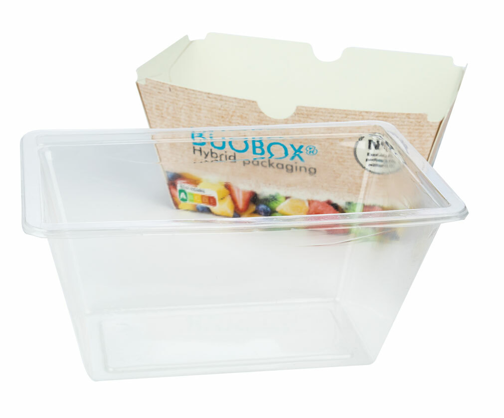 Damit kommt die Duobox mit bis zu 50 % weniger Plastik aus und bleibt dank der Kartonummantelung dennoch stabil. Da sich die Kartonummantelung leicht entfernen lässt, ist sie bequem zu nutzen und zu entsorgen. Der Karton kann außen bedruckt werden, damit Ihr Produkt im Regal auffällt. Natürlich kann auch die Innenseite bedruckt werden, beispielsweise mit Tipps für die Zubereitung des Produkts und die Entsorgung der Verpackung.