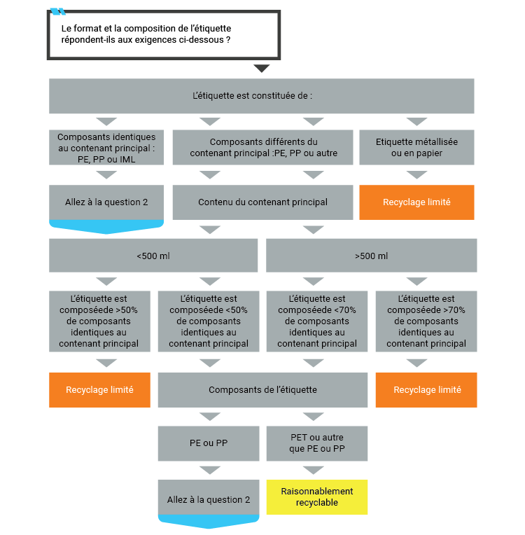 Les deux dernières questions évaluent la solubilité des adhésifs et si le matériau est mono-matériau PP ou PE.